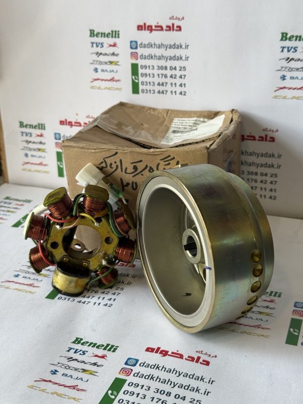 فلکه برق (آهنربا) همراه با بوبین (دستگاه) سیم پیچی برق موتور tvs راکس کاربرات اصلی