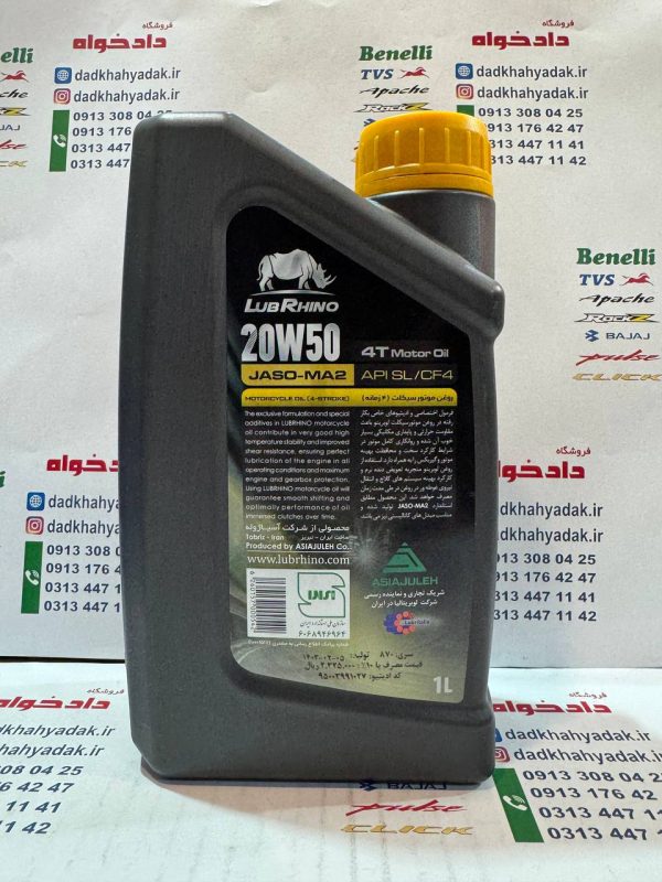 روغن موتور لوبرینو(lubrhino) (20w50) روغن موتور 4 زمانه دارای فرمول اختصاصی که باعث مقاومت در برابر حرارت و پایداری مکانیکی میشود